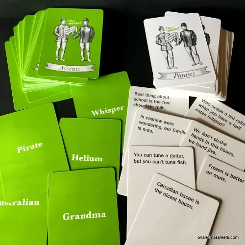 The 50 accent cards? Well, there's a wide variety of wacky ones, including — to my delight — a Grandma accent. Which means I could stump one and all just by speaking in my regular voice/accent/sound.