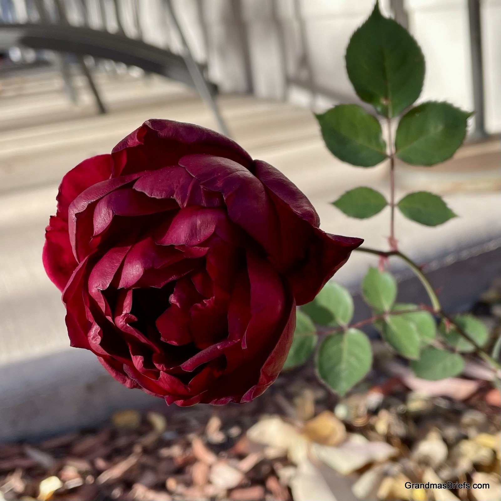 We had our first hard freeze of the season in late October. Which meant the first full rose that bloomed on the rose bush Jim and I planted for our 40th anniversary in June — a ruby-colored “Queen Bee” rose for our Ruby Anniversary — would be our last of the season. So I snapped a pic then snipped the rose in hopes it might open further in a vase indoors.