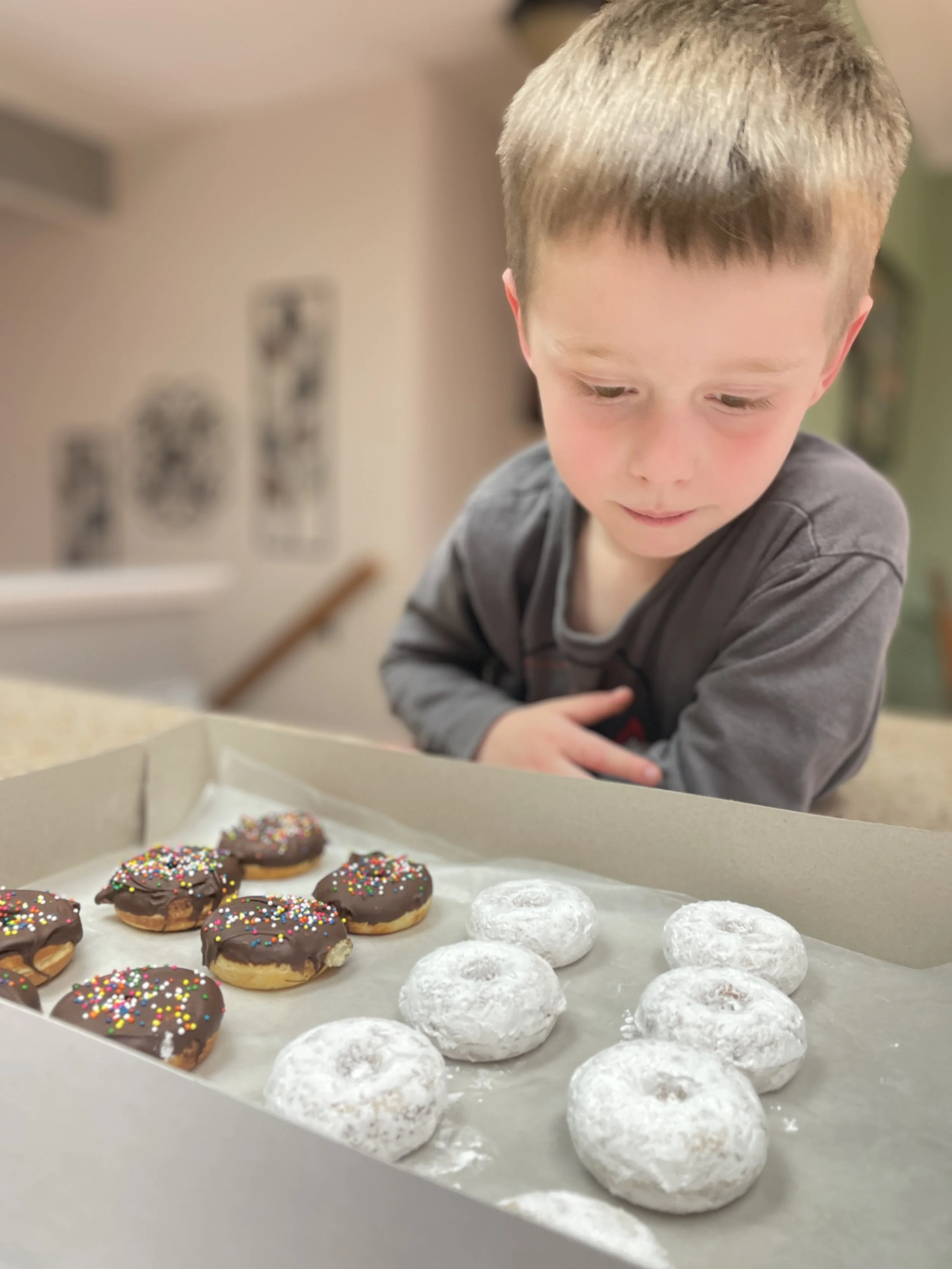 /Benjamin surveys the mini donuts he and I made for him and Robert to give Mommy and Daddy for Valentine’s Day.