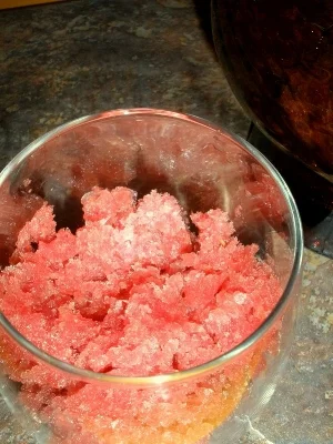 In food processor or blender, combine all ingredients until smooth. Pour into dish and freeze overnight or until completely frozen. To serve, scrape shavings of granita into serving dishes. Makes about four servings.